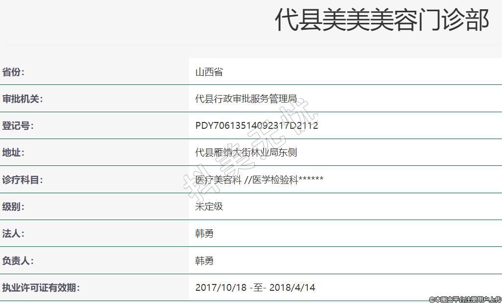 代縣美美美容2022-05-21成立,地址:代縣雁靖大街林業(yè)局東側,診療科目:醫(yī)療美容科 //醫(yī)學檢驗科******
