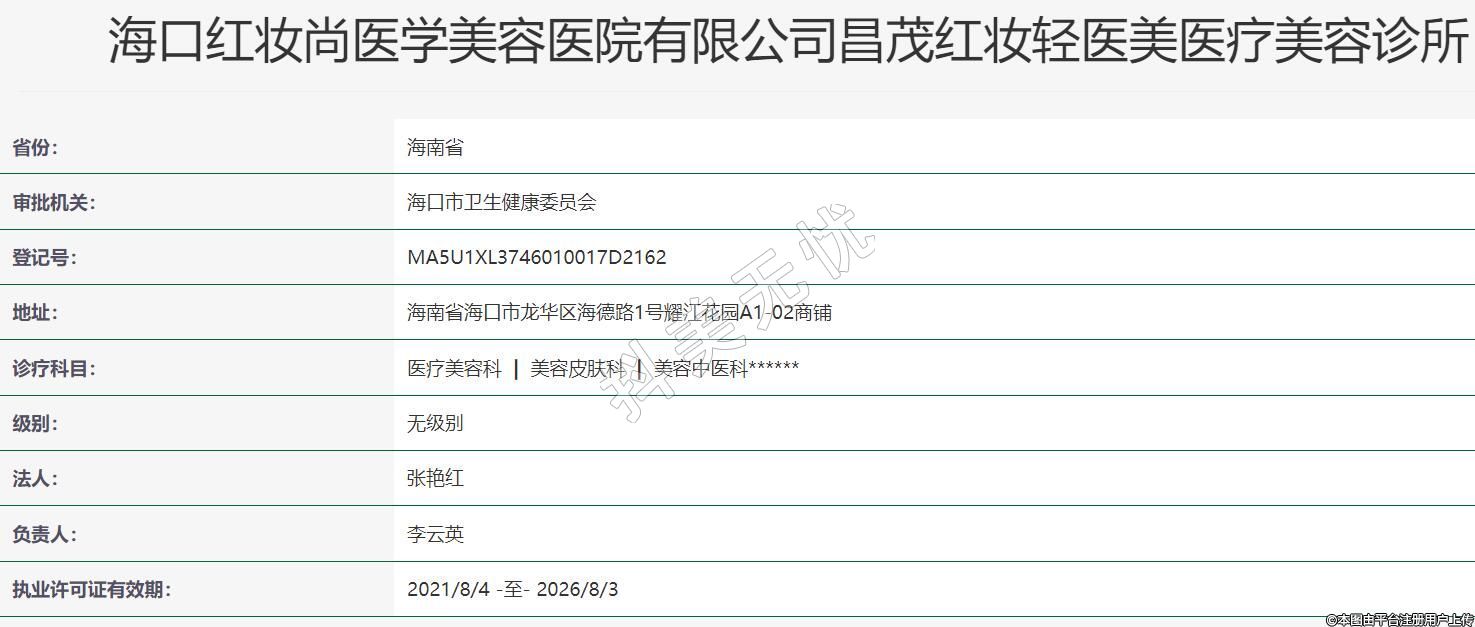 海口紅妝尚醫(yī)學(xué)美容醫(yī)院有限公司昌茂紅妝輕醫(yī)美醫(yī)療美容診所