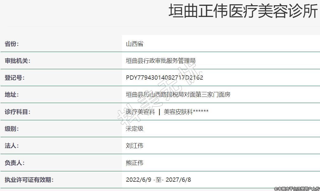 垣曲正偉醫(yī)療美容地址:垣曲縣歷山西路國(guó)稅局對(duì)面第三家門面房,診療科目:醫(yī)療美容科 | 美容皮膚科******