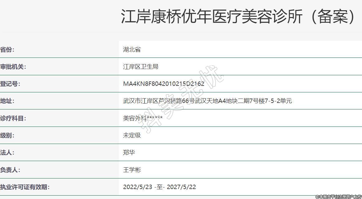 武漢康橋優(yōu)年醫(yī)療美容2016年08月05日成立,地址:武漢市江岸區(qū)蘆溝橋路66號武漢天地A4地塊二期7號樓7-5-2單元,診療科目:美容外科******
