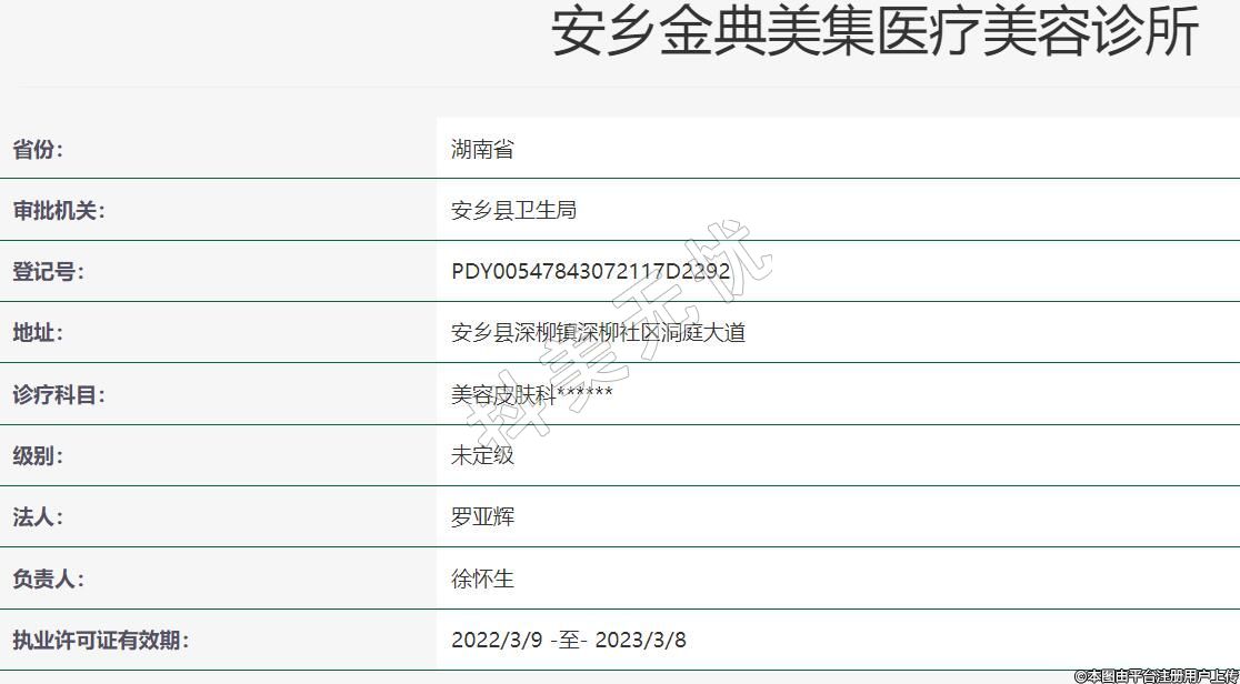 安鄉(xiāng)金典美集醫(yī)療美容2021年01月29日成立,地址:安鄉(xiāng)縣深柳鎮(zhèn)深柳社區(qū)洞庭大道,診療科目:美容皮膚科******