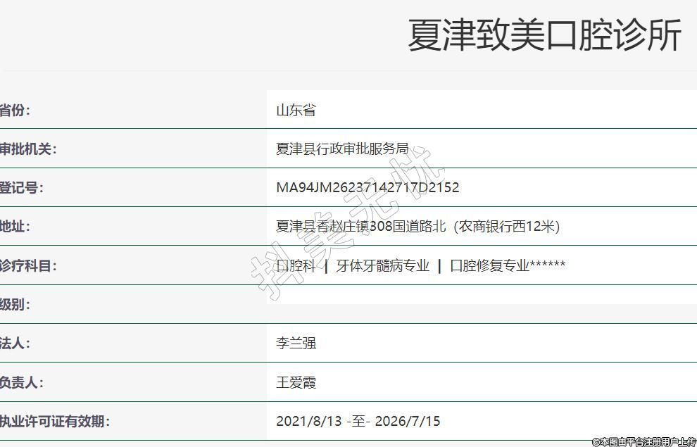 夏津致美口腔2021年07月26日成立,地址:夏津縣香趙莊鎮(zhèn)308國道路北(農(nóng)商銀行西12米),診療科目:口腔科 | 牙體牙髓病專業(yè) | 口腔修復(fù)專業(yè)******