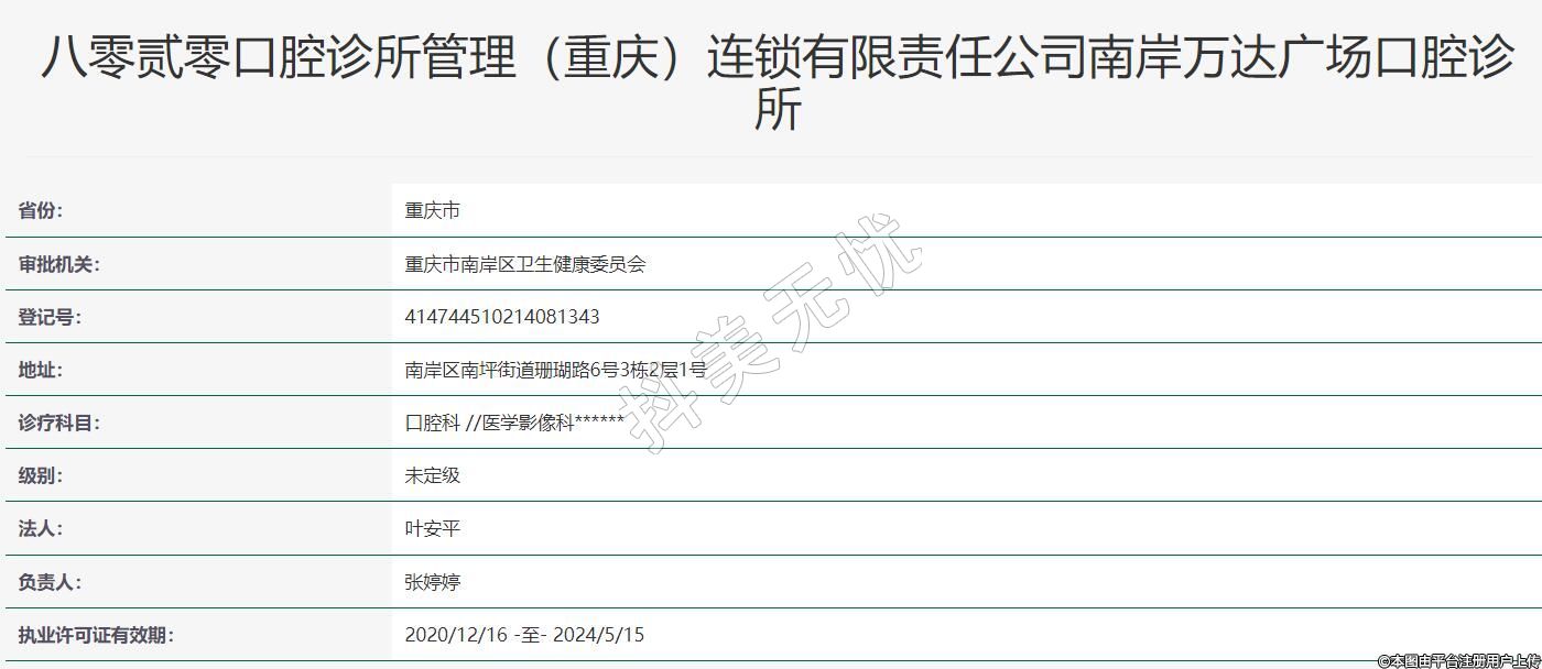 重慶八零貳零口腔(南岸)2019-03-21成立,地址:南岸區(qū)南坪街道珊瑚路6號3棟2層1號,診療科目:口腔科 //醫(yī)學(xué)影像科******