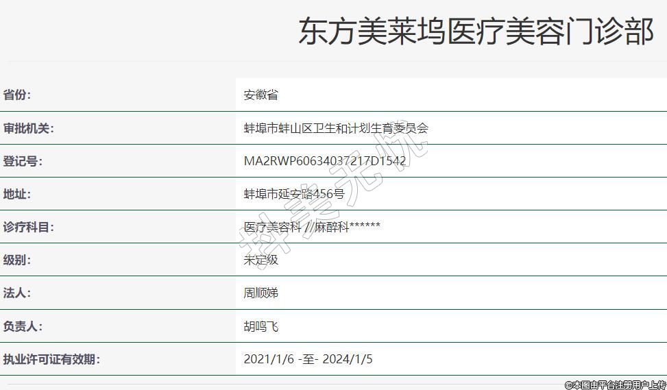?蚌埠東方美萊塢醫(yī)療美容2018-07-16成立,地址:蚌埠市延安路456號(hào),診療科目:醫(yī)療美容科 //麻醉科******