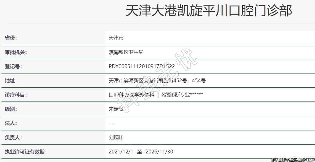 天津大港凱旋平川口腔2012-07-18成立,地址:天津市濱海新區(qū)大港街凱旋街452號、454號,診療科目:口腔科 //醫(yī)學(xué)影像科 | X線診斷專業(yè)******