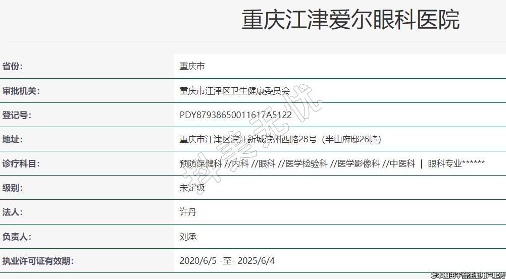 重慶江津愛爾眼科2016-03-10成立,地址:重慶市江津區(qū)濱江新城濱州西路28號(半山府邸26幢),診療科目:預防保健科 //內(nèi)科 //眼科 //醫(yī)學檢驗科 //醫(yī)學影像科 //中醫(yī)科 | 眼科專業(yè)******