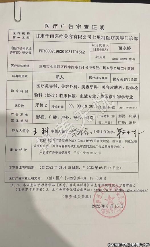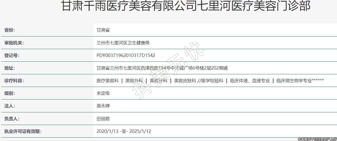 甘肅千雨醫(yī)療美容有限公司七里河醫(yī)療美容門診部