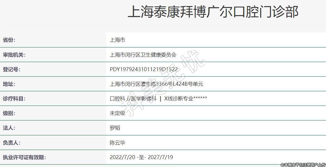 上海泰康拜博廣爾口腔2017-05-24成立,地址:上海市閔行區(qū)漕寶路3366號L424B號單元,診療科目:口腔科 //醫(yī)學影像科 | X線診斷專業(yè)******