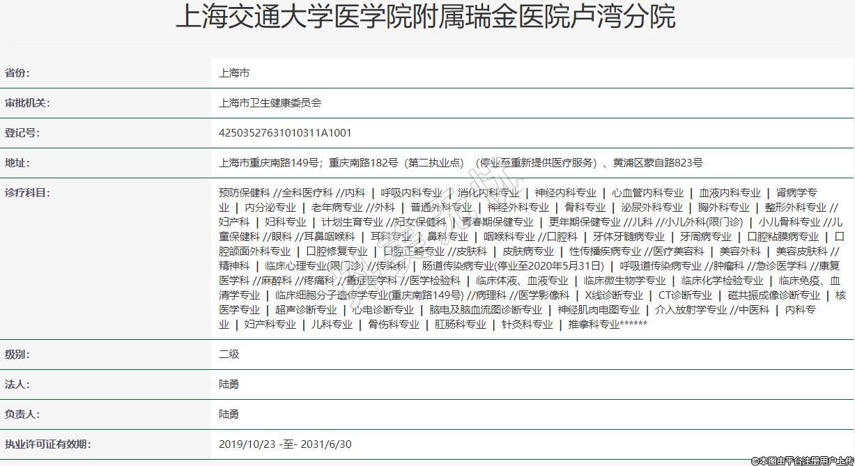 地址:上海市重慶南路149號;重慶南路182號(第二執(zhí)業(yè)點(diǎn))(停業(yè)至重新提供醫(yī)療服務(wù))、黃浦區(qū)蒙自路823號