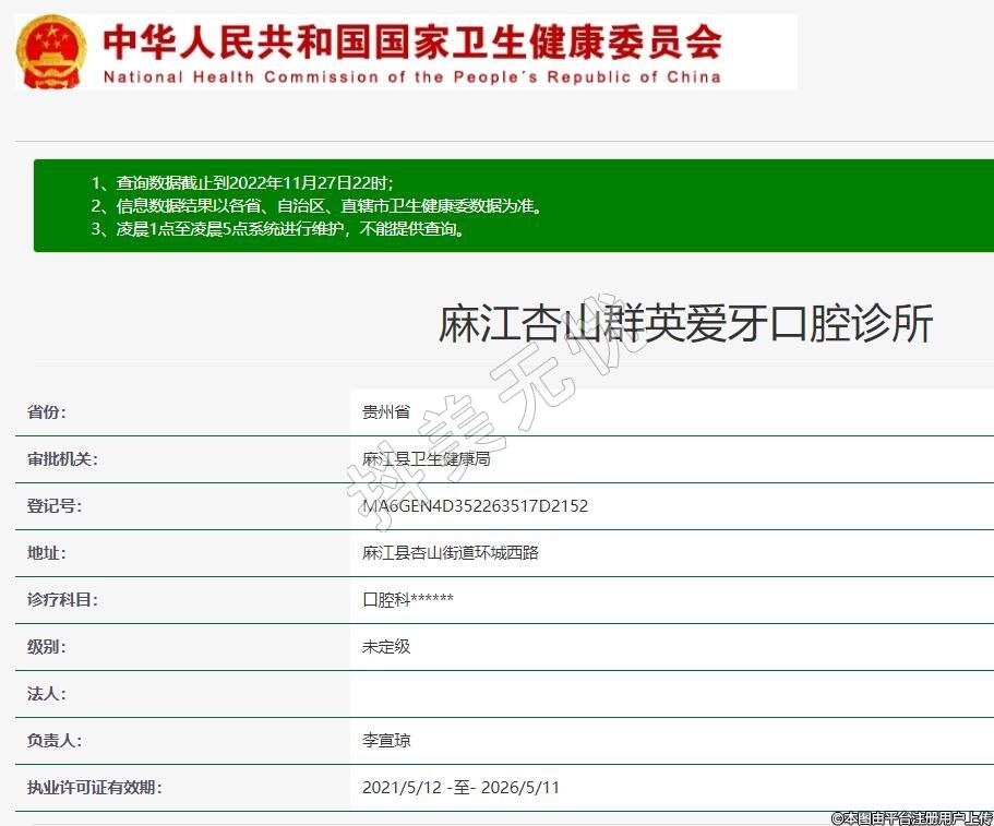 麻江杏山群英愛牙口腔2022-03-09成立,地址:麻江縣杏山街道環(huán)城西路,診療科目:口腔科******