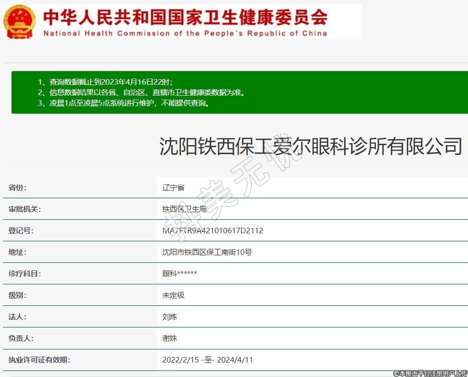 沈陽鐵西保工愛爾眼科診所有限公司,診療科目:眼科******