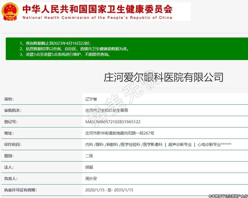 莊河愛爾眼科醫(yī)院有限公司,診療科目:內(nèi)科 /眼科 /麻醉科 /醫(yī)學(xué)檢驗科 /醫(yī)學(xué)影像科 | 超聲診斷專業(yè) | 心電診斷專業(yè)******