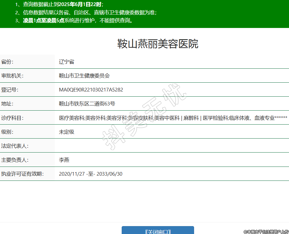 省份:遼寧省審批機(jī)關(guān):鞍山市衛(wèi)生健康委員會(huì)登記號(hào):MA0QE90R221030217A5282地址:鞍山市鐵東區(qū)二道街63號(hào)診療科目:醫(yī)療美容科;美容外科;美容牙科;美容皮膚科;美容中醫(yī)科 | 麻醉科 | 醫(yī)學(xué)檢驗(yàn)科;臨床體液、血液專業(yè)******級(jí)別:未定級(jí)法定代表人:主要負(fù)責(zé)人:李燕執(zhí)業(yè)許可證有效期:2020/11/27 -至- 2033/06/30 -