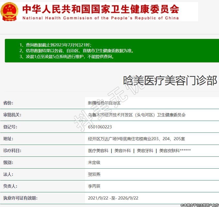 新疆晗美醫(yī)療美容門診部,位于烏魯木齊經(jīng)濟技術(shù)開發(fā)區(qū)(頭屯河區(qū))澎湖路88號烏魯木齊經(jīng)開萬達廣場9號底商住宅樓商業(yè)203、204、205室,于2021年成立。門診設(shè)有整形外科、美容皮膚科、口腔科等科室。