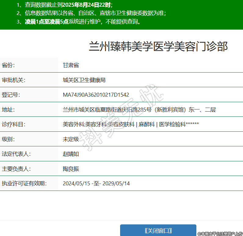 省份:甘肅省審批機(jī)關(guān):城關(guān)區(qū)衛(wèi)生健康局登記號(hào):MA74J90A362010217D1542地址:蘭州市城關(guān)區(qū)臨夏路街道慶陽(yáng)路285號(hào)(新勝利賓館)東一、二層診療科目:美容外科;美容牙科;美容皮膚科 | 麻醉科 | 醫(yī)學(xué)檢驗(yàn)科******級(jí)別:未定級(jí)法定代表人:趙婧如主要負(fù)責(zé)人:陶良振執(zhí)業(yè)許可證有效期:2024/05/15 -至- 2029/05/14 -