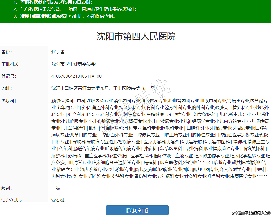 省份:遼寧省審批機關(guān):沈陽市衛(wèi)生健康委員會登記號:41057896421010511A1001地址:沈陽市皇姑區(qū)黃河南大街20號、于洪區(qū)陵東街135-8號診療科目:預(yù)防保健科 | 內(nèi)科;呼吸內(nèi)科專業(yè);消化內(nèi)科專業(yè);神經(jīng)內(nèi)科專業(yè);心血管內(nèi)科專業(yè);血液內(nèi)科專業(yè);腎病學(xué)專業(yè);內(nèi)分泌專業(yè);老年病專業(yè) | 外科;普通外科專業(yè);神經(jīng)外科專業(yè);骨科專業(yè);泌尿外科專業(yè);胸外科專業(yè);心臟大血管外科專業(yè);整形外科專業(yè) | 婦產(chǎn)科;婦科專業(yè);產(chǎn)科專業(yè);計劃生育專業(yè);生殖健康與不孕癥專業(yè) | 婦女保健科 | 兒科;新生兒專業(yè);小兒消化專業(yè);小兒呼吸專業(yè);小兒心臟病專業(yè);小兒腎病專業(yè);小兒血液病專業(yè);小兒神經(jīng)病學(xué)專業(yè);小兒內(nèi)分泌專業(yè);小兒遺傳病專業(yè) | 兒童保健科 | 眼科 | 耳鼻咽喉科;耳科專業(yè);鼻科專業(yè);咽喉科專業(yè) | 口腔科;牙體牙髓病專業(yè);牙周病專業(yè);口腔粘膜病專業(yè);兒童口腔專業(yè);口腔頜面外科專業(yè);口腔修復(fù)專業(yè);口腔正畸專業(yè);口腔種植專業(yè);口腔頜面醫(yī)學(xué)影像專業(yè);預(yù)防口腔專業(yè) | 皮膚科;皮膚病專業(yè);性傳播疾病專業(yè) | 醫(yī)療美容科;美容外科;美容皮膚科;美容中醫(yī)科 | 精神科;精神衛(wèi)生專業(yè) | 傳染科;腸道傳染病專業(yè);呼吸道傳染病專業(yè) | 腫瘤科 | 急診醫(yī)學(xué)科 | 職業(yè)病科;職業(yè)健康監(jiān)護專業(yè) | 臨終關(guān)懷科 | 麻醉科 | 疼痛科 | 重癥醫(yī)學(xué)科(床位32張) | 醫(yī)學(xué)檢驗科;臨床體液、血液專業(yè);臨床微生物學(xué)專業(yè);臨床化學(xué)檢驗專業(yè);臨床免疫、血清學(xué)專業(yè);臨床細(xì)胞分子遺傳學(xué)專業(yè) | 病理科 | 醫(yī)學(xué)影像科;X線診斷專業(yè);CT診斷專業(yè);磁共振成像診斷專業(yè);核醫(yī)學(xué)專業(yè);超聲診斷專業(yè);心電診斷專業(yè);腦電及腦血流圖診斷專業(yè);神經(jīng)肌肉電圖專業(yè);介入放射學(xué)專業(yè) | 中醫(yī)科;內(nèi)科專業(yè);外科專業(yè);婦產(chǎn)科專業(yè);皮膚科專業(yè);骨傷科專業(yè);老年病科專業(yè);針灸科專業(yè);推拿科專業(yè);康復(fù)醫(yī)學(xué)專業(yè)******級別:三級法定代表人:沈春健主要負(fù)責(zé)人:沈春健執(zhí)業(yè)許可證有效期:2023/04/10 -至- 2026/08/09 -