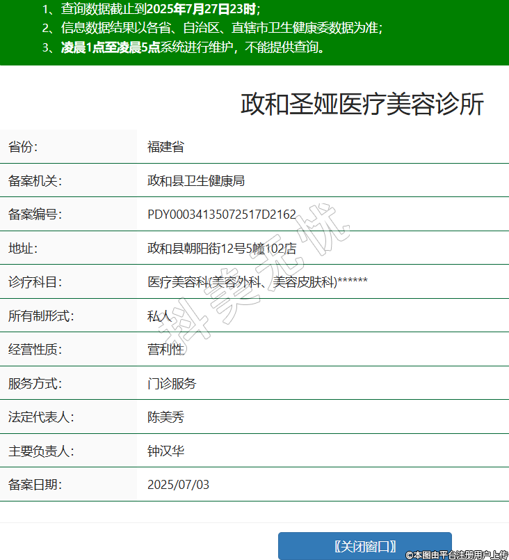 省份:福建省備案機(jī)關(guān):政和縣衛(wèi)生健康局備案編號(hào):PDY00034135072517D2162地址:政和縣朝陽(yáng)街12號(hào)5幢102店診療科目:醫(yī)療美容科(美容外科、美容皮膚科)******所有制形式:私人經(jīng)營(yíng)性質(zhì):營(yíng)利性服務(wù)方式:門(mén)診服務(wù)法定代表人:陳美秀主要負(fù)責(zé)人:鐘漢華備案日期:2025/07/03 -