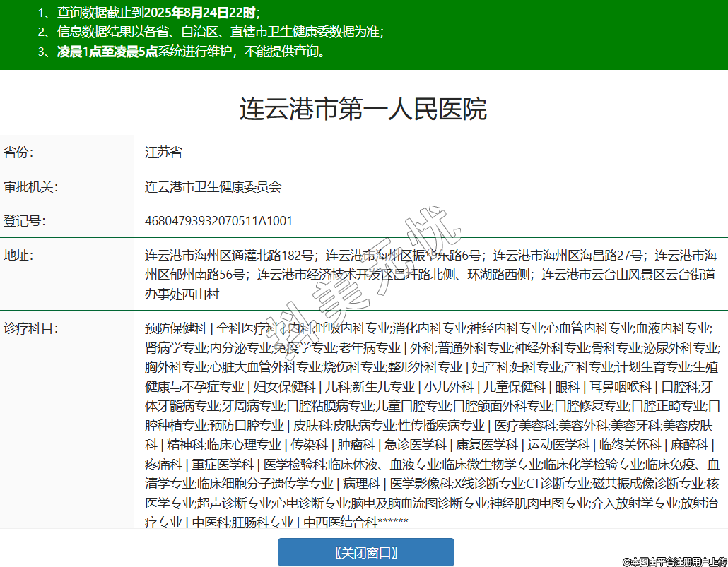 省份:江蘇省審批機(jī)關(guān):連云港市衛(wèi)生健康委員會(huì)登記號(hào):46804793932070511A1001地址:連云港市海州區(qū)通灌北路182號(hào);連云港市海州區(qū)振華東路6號(hào);連云港市海州區(qū)海昌路27號(hào);連云港市海州區(qū)郁州南路56號(hào);連云港市經(jīng)濟(jì)技術(shù)開發(fā)區(qū)昌圩路北側(cè)、環(huán)湖路西側(cè);連云港市云臺(tái)山風(fēng)景區(qū)云臺(tái)街道辦事處西山村診療科目:預(yù)防保健科 | 全科醫(yī)療科 | 內(nèi)科;呼吸內(nèi)科專業(yè);消化內(nèi)科專業(yè);神經(jīng)內(nèi)科專業(yè);心血管內(nèi)科專業(yè);血液內(nèi)科專業(yè);腎病學(xué)專業(yè);內(nèi)分泌專業(yè);免疫學(xué)專業(yè);老年病專業(yè) | 外科;普通外科專業(yè);神經(jīng)外科專業(yè);骨科專業(yè);泌尿外科專業(yè);胸外科專業(yè);心臟大血管外科專業(yè);燒傷科專業(yè);整形外科專業(yè) | 婦產(chǎn)科;婦科專業(yè);產(chǎn)科專業(yè);計(jì)劃生育專業(yè);生殖健康與不孕癥專業(yè) | 婦女保健科 | 兒科;新生兒專業(yè) | 小兒外科 | 兒童保健科 | 眼科 | 耳鼻咽喉科 | 口腔科;牙體牙髓病專業(yè);牙周病專業(yè);口腔粘膜病專業(yè);兒童口腔專業(yè);口腔頜面外科專業(yè);口腔修復(fù)專業(yè);口腔正畸專業(yè);口腔種植專業(yè);預(yù)防口腔專業(yè) | 皮膚科;皮膚病專業(yè);性傳播疾病專業(yè) | 醫(yī)療美容科;美容外科;美容牙科;美容皮膚科 | 精神科;臨床心理專業(yè) | 傳染科 | 腫瘤科 | 急診醫(yī)學(xué)科 | 康復(fù)醫(yī)學(xué)科 | 運(yùn)動(dòng)醫(yī)學(xué)科 | 臨終關(guān)懷科 | 麻醉科 | 疼痛科 | 重癥醫(yī)學(xué)科 | 醫(yī)學(xué)檢驗(yàn)科;臨床體液、血液專業(yè);臨床微生物學(xué)專業(yè);臨床化學(xué)檢驗(yàn)專業(yè);臨床免疫、血清學(xué)專業(yè);臨床細(xì)胞分子遺傳學(xué)專業(yè) | 病理科 | 醫(yī)學(xué)影像科;X線診斷專業(yè);CT診斷專業(yè);磁共振成像診斷專業(yè);核醫(yī)學(xué)專業(yè);超聲診斷專業(yè);心電診斷專業(yè);腦電及腦血流圖診斷專業(yè);神經(jīng)肌肉電圖專業(yè);介入放射學(xué)專業(yè);放射治療專業(yè) | 中醫(yī)科;肛腸科專業(yè) | 中西醫(yī)結(jié)合科******級(jí)別:三級(jí)法定代表人:施輝主要負(fù)責(zé)人:李愛民執(zhí)業(yè)許可證有效期:2020/08/13 -至- 2035/08/12 -