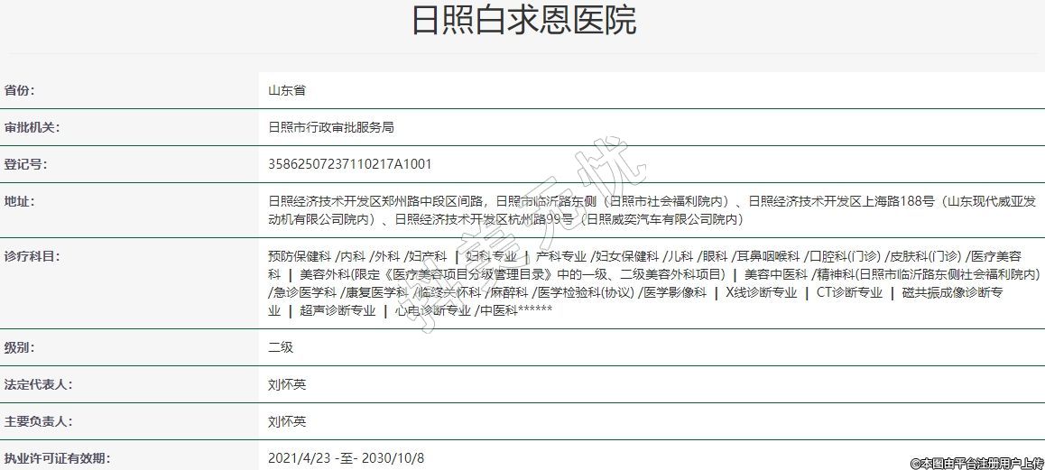 診療科目:預(yù)防保健科 /內(nèi)科 /外科 /婦產(chǎn)科 | 婦科專(zhuān)業(yè) | 產(chǎn)科專(zhuān)業(yè) /婦女保健科 /兒科 /眼科 /耳鼻咽喉科 /口腔科(門(mén)診) /皮膚科(門(mén)診) /醫(yī)療美容科 | 美容外科(限定《醫(yī)療美容項(xiàng)目分級(jí)管理目錄》中的一級(jí)、二級(jí)美容外科項(xiàng)目) | 美容中醫(yī)科 /精神科(日照市臨沂路東側(cè)社會(huì)福利院內(nèi)) /急診醫(yī)學(xué)科 /康復(fù)醫(yī)學(xué)科 /臨終關(guān)懷科 /麻醉科 /醫(yī)學(xué)檢驗(yàn)科(協(xié)議) /醫(yī)學(xué)影像科 | X線診斷專(zhuān)業(yè) | CT診斷專(zhuān)業(yè) | 磁共振成像診斷專(zhuān)業(yè) | 超聲診斷專(zhuān)業(yè) | 心電診斷專(zhuān)業(yè) /中醫(yī)科******