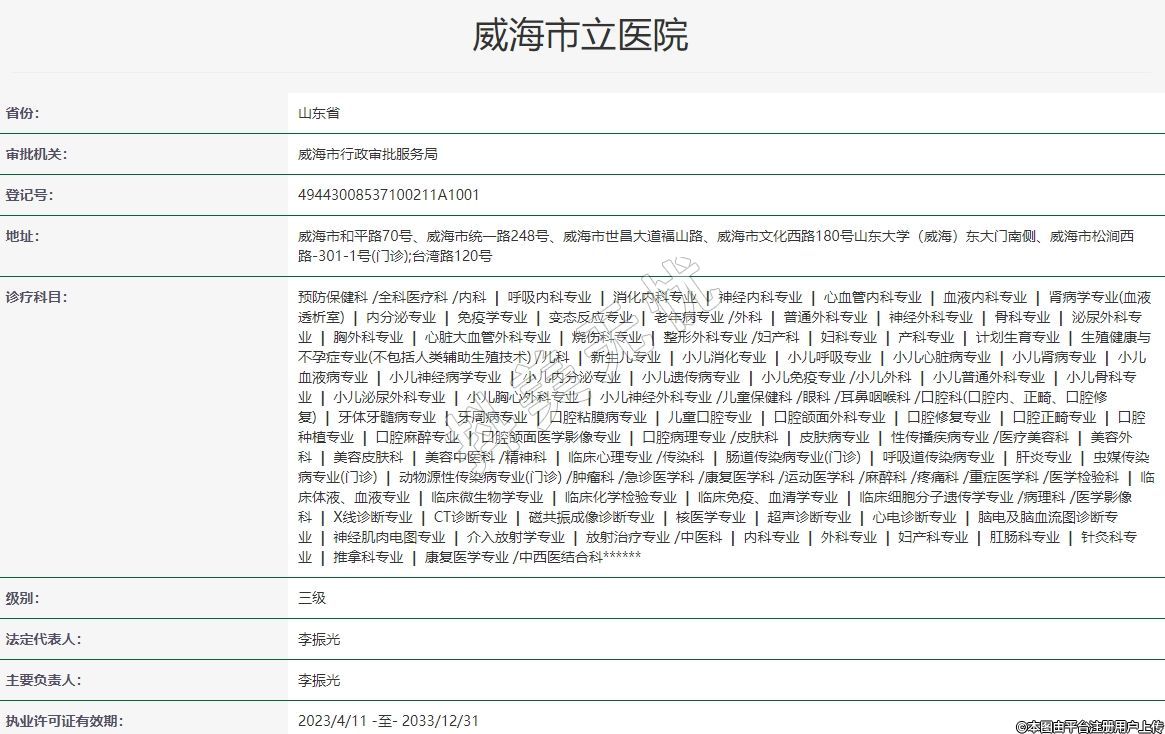 地址:威海市和平路70號(hào)、威海市統(tǒng)一路248號(hào)、威海市世昌大道福山路、威海市文化西路180號(hào)山東大學(xué)(威海)東大門(mén)南側(cè)、威海市松澗西路-301-1號(hào)(門(mén)診);臺(tái)灣路120號(hào)