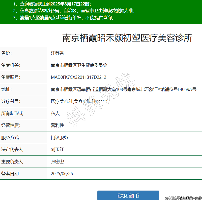 省份:江蘇省備案機(jī)關(guān):南京市棲霞區(qū)衛(wèi)生健康委員會備案編號:MAD0FK7CX32011317D2212地址:南京市棲霞區(qū)邁皋橋街道棲霞大道108號南京城北萬象匯A館鋪位號L4059A號診療科目:醫(yī)療美容科(美容皮膚科)******所有制形式:私人經(jīng)營性質(zhì):營利性服務(wù)方式:門診服務(wù)法定代表人:劉玉紅主要負(fù)責(zé)人:張密密備案日期:2025/06/25 -