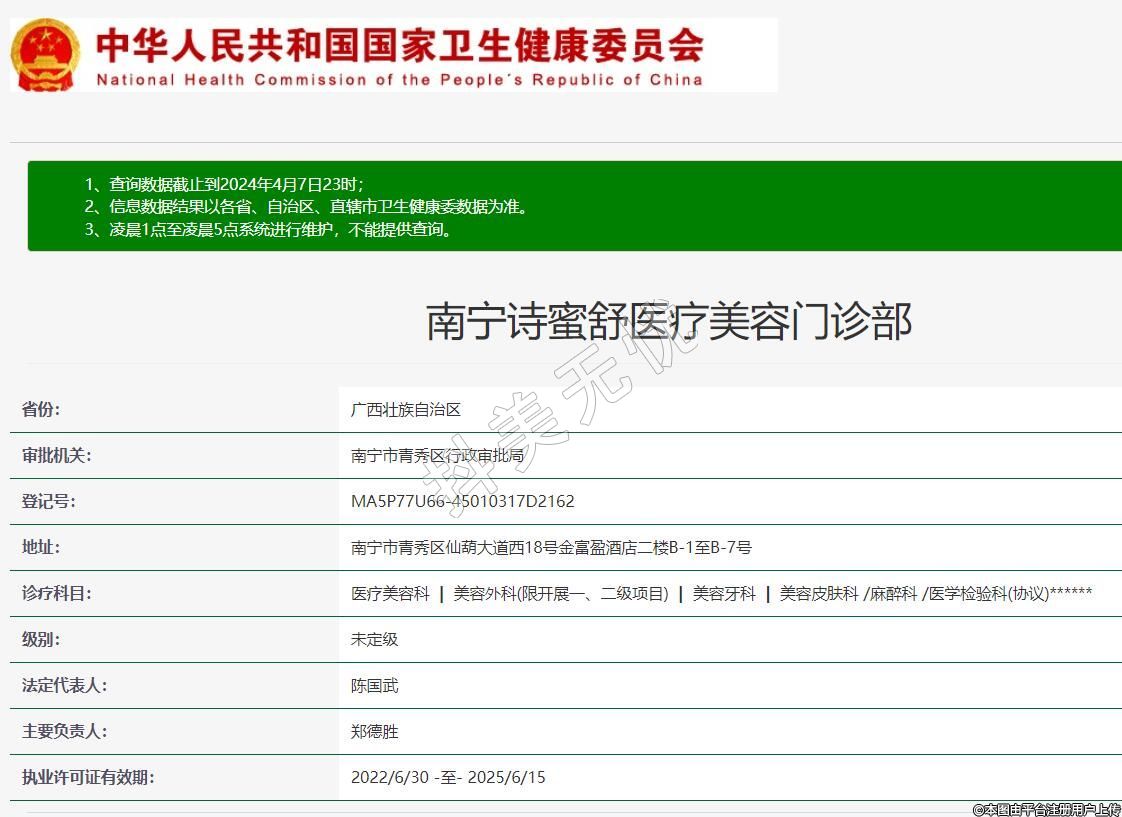 南寧詩蜜舒醫(yī)療美容門診部,診療科目:醫(yī)療美容科 | 美容外科(限開展一、二級項目) | 美容牙科 | 美容皮膚科 /麻醉科 /醫(yī)學(xué)檢驗科(協(xié)議)******