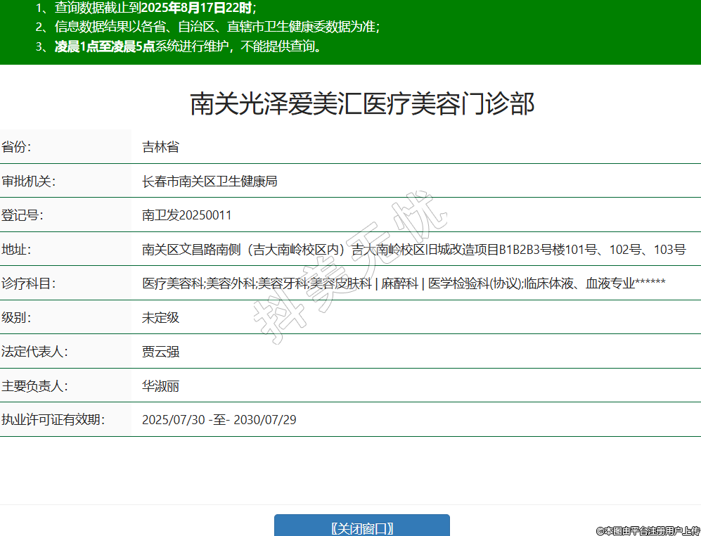 省份:吉林省審批機關:長春市南關區(qū)衛(wèi)生健康局登記號:南衛(wèi)發(fā)20250011地址:南關區(qū)文昌路南側(吉大南嶺校區(qū)內)吉大南嶺校區(qū)舊城改造項目B1B2B3號樓101號、102號、103號診療科目:醫(yī)療美容科;美容外科;美容牙科;美容皮膚科 | 麻醉科 | 醫(yī)學檢驗科(協(xié)議);臨床體液、血液專業(yè)******級別:未定級法定代表人:賈云強主要負責人:華淑麗執(zhí)業(yè)許可證有效期:2025/07/30 -至- 2030/07/29 -