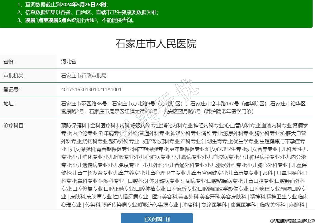 石家莊市范西路36號(hào);石家莊市方北路9號(hào)(方北院區(qū));石家莊市倉豐路197號(hào)(建華院區(qū));石家莊市裕華區(qū)富康路2號(hào),石家莊市鹿泉區(qū)紅旗大街658號(hào);長安區(qū)藍(lán)月路6號(hào)(養(yǎng)護(hù)院老年醫(yī)學(xué)門診)