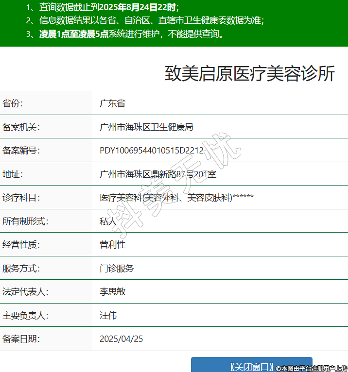 省份:廣東省備案機關(guān):廣州市海珠區(qū)衛(wèi)生健康局備案編號:PDY10069544010515D2212地址:廣州市海珠區(qū)鼎新路87號201室診療科目:醫(yī)療美容科(美容外科、美容皮膚科)******所有制形式:私人經(jīng)營性質(zhì):營利性服務(wù)方式:門診服務(wù)法定代表人:李思敏主要負責人:汪偉備案日期:2025/04/25 -