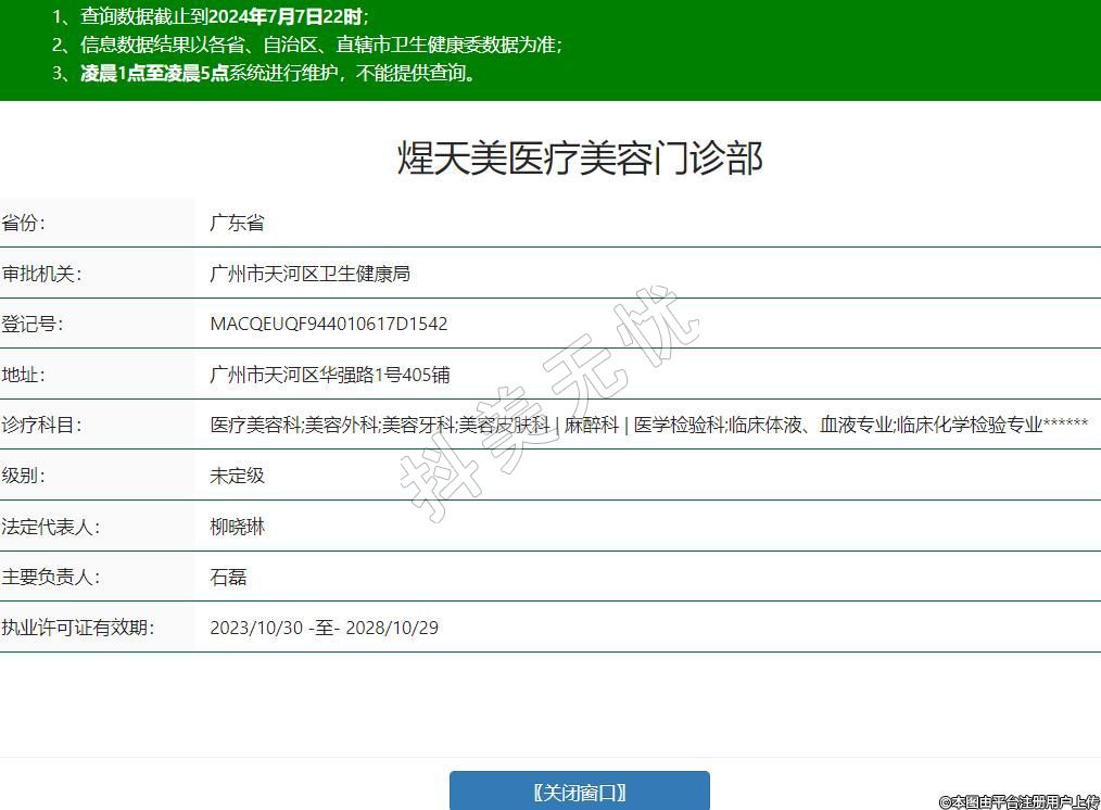 煋天美醫(yī)療美容門診部,診療科目:醫(yī)療美容科;美容外科;美容牙科;美容皮膚科 | 麻醉科 | 醫(yī)學(xué)檢驗科;臨床體液、血液專業(yè);臨床化學(xué)檢驗專業(yè)******
