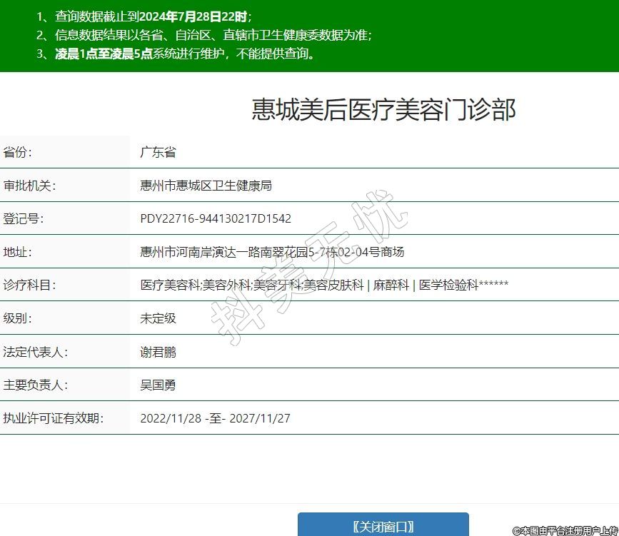 惠城美后醫(yī)療美容門診部,診療科目:醫(yī)療美容科;美容外科;美容牙科;美容皮膚科 | 麻醉科 | 醫(yī)學(xué)檢驗(yàn)科******