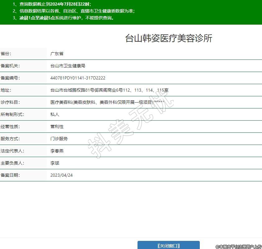 臺山韓姿醫(yī)療美容診所,診療科目:醫(yī)療美容科(美容皮膚科、美容外科僅限開展一級項目)******