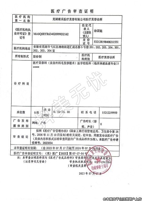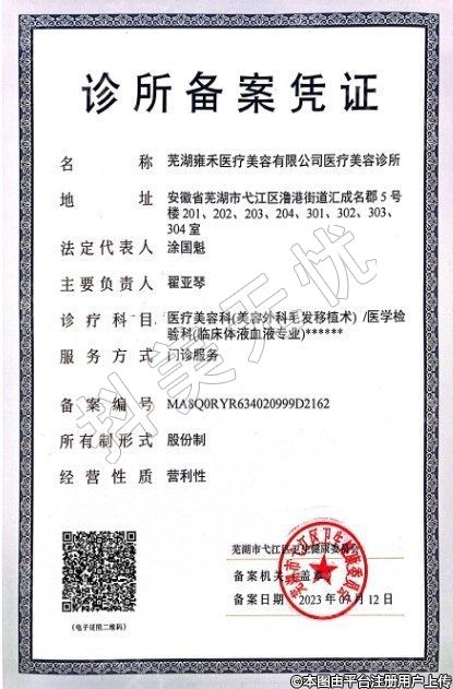 蕪湖雍禾醫(yī)療美容有限公司醫(yī)療美容診所,診療科目:醫(yī)療美容科(美容外科毛發(fā)移植術(shù)) | 醫(yī)學檢驗科(臨床體液血液專業(yè))******