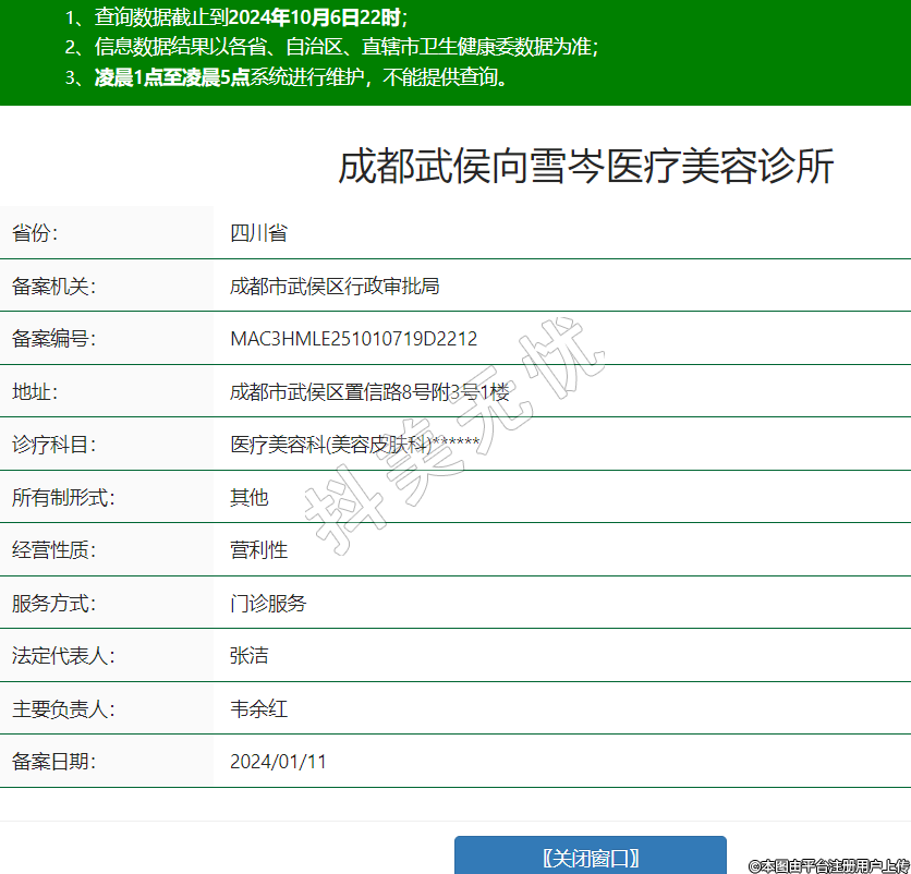成都武侯向雪岑醫(yī)療美容診所,診療科目:醫(yī)療美容科(美容皮膚科)******