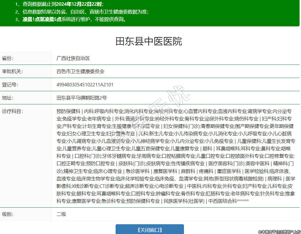 預(yù)防保健科 | 內(nèi)科;呼吸內(nèi)科專業(yè);消化內(nèi)科專業(yè);神經(jīng)內(nèi)科專業(yè);心血管內(nèi)科專業(yè);血液內(nèi)科專業(yè);腎病學(xué)專業(yè);內(nèi)分泌專業(yè);免疫學(xué)專業(yè);老年病專業(yè) | 外科;普通外科專業(yè);神經(jīng)外科專業(yè);骨科專業(yè);泌尿外科專業(yè);燒傷科專業(yè) | 婦產(chǎn)科;婦科專業(yè);產(chǎn)科專業(yè);計(jì)劃生育專業(yè);生殖健康與不孕癥專業(yè) | 婦女保健科(門診);青春期保健專業(yè);圍產(chǎn)期保健專業(yè);更年期保健專業(yè);婦女心理衛(wèi)生專業(yè);婦女營(yíng)養(yǎng)專業(yè) | 兒科;新生兒專業(yè);小兒傳染病專業(yè);小兒消化專業(yè);小兒呼吸專業(yè);小兒心臟病專業(yè);小兒腎病專業(yè);小兒血液病專業(yè);小兒神經(jīng)病學(xué)專業(yè);小兒內(nèi)分泌專業(yè);小兒免疫專業(yè) | 兒童保健科;兒童生長(zhǎng)發(fā)育專業(yè);兒童營(yíng)養(yǎng)專業(yè);兒童心理衛(wèi)生專業(yè);兒童五官保健專業(yè);兒童康復(fù)專業(yè) | 眼科 | 耳鼻咽喉科;耳科專業(yè);鼻科專業(yè);咽喉科專業(yè) | 口腔科(門診);牙體牙髓病專業(yè);牙周病專業(yè);口腔粘膜病專業(yè);兒童口腔專業(yè);口腔頜面外科專業(yè);口腔修復(fù)專業(yè);口腔正畸專業(yè);預(yù)防口腔專業(yè) | 皮膚科(門診);皮膚病專業(yè);性傳播疾病專業(yè) | 醫(yī)療美容科(門診);美容中醫(yī)科 | 精神科(門診);精神衛(wèi)生專業(yè);臨床心理專業(yè) | 急診醫(yī)學(xué)科 | 康復(fù)醫(yī)學(xué)科 | 麻醉科 | 疼痛科 | 重癥醫(yī)學(xué)科 | 醫(yī)學(xué)檢驗(yàn)科;臨床體液、血液專業(yè);臨床微生物學(xué)專業(yè);臨床化學(xué)檢驗(yàn)專業(yè);臨床免疫、血清學(xué)專業(yè);其他(新型冠狀病毒核酸檢測(cè)) | 病理科 | 醫(yī)學(xué)影像科;X線診斷專業(yè);CT診斷專業(yè);超聲診斷專業(yè);心電診斷專業(yè) | 中醫(yī)科;內(nèi)科專業(yè);外科專業(yè);婦產(chǎn)科專業(yè);兒科專業(yè);皮膚科專業(yè);眼科專業(yè);耳鼻咽喉科專業(yè);口腔科專業(yè);腫瘤科專業(yè);骨傷科專業(yè);肛腸科專業(yè);老年病科專業(yè);針灸科專業(yè);推拿科專業(yè);康復(fù)醫(yī)學(xué)專業(yè);急診科專業(yè);預(yù)防保健科專業(yè) | 民族醫(yī)學(xué)科(壯醫(yī)學(xué)) | 中西醫(yī)結(jié)合科******