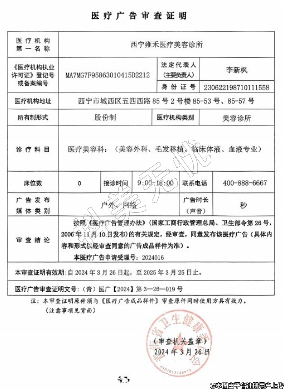 西寧雍禾植發(fā)醫(yī)療美容診所創(chuàng)辦于2022年,隸屬雍禾植發(fā)連鎖,位于西寧市城西區(qū)五四西路85號2號樓85-53號、85-57號。雍禾植發(fā)連鎖擁有多年的植發(fā)技術(shù)經(jīng)驗(yàn),憑借先進(jìn)的設(shè)備和專業(yè)的團(tuán)隊,為每一位顧客量身定制個性化的植發(fā)方案。我們采用的技術(shù)是目前最先進(jìn)的FUE無痕植發(fā)技術(shù),不僅術(shù)后恢復(fù)快,而且效果自然持久。