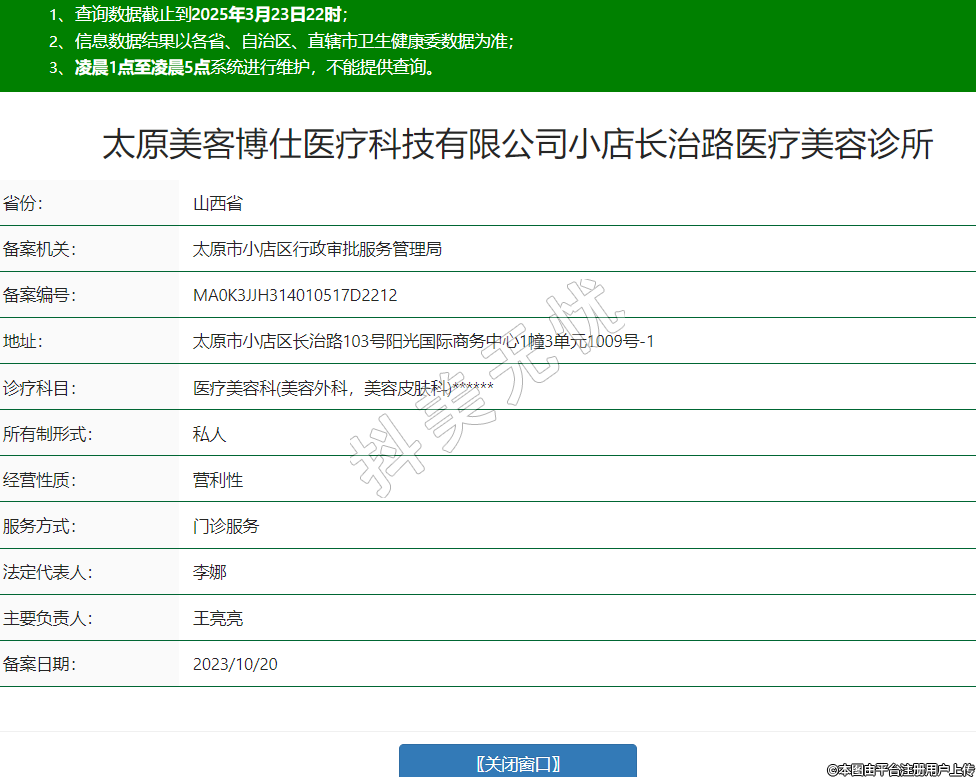 太原美客博仕醫(yī)療科技有限公司小店長治路醫(yī)療美容診所,診療科目:醫(yī)療美容科(美容外科,美容皮膚科)******