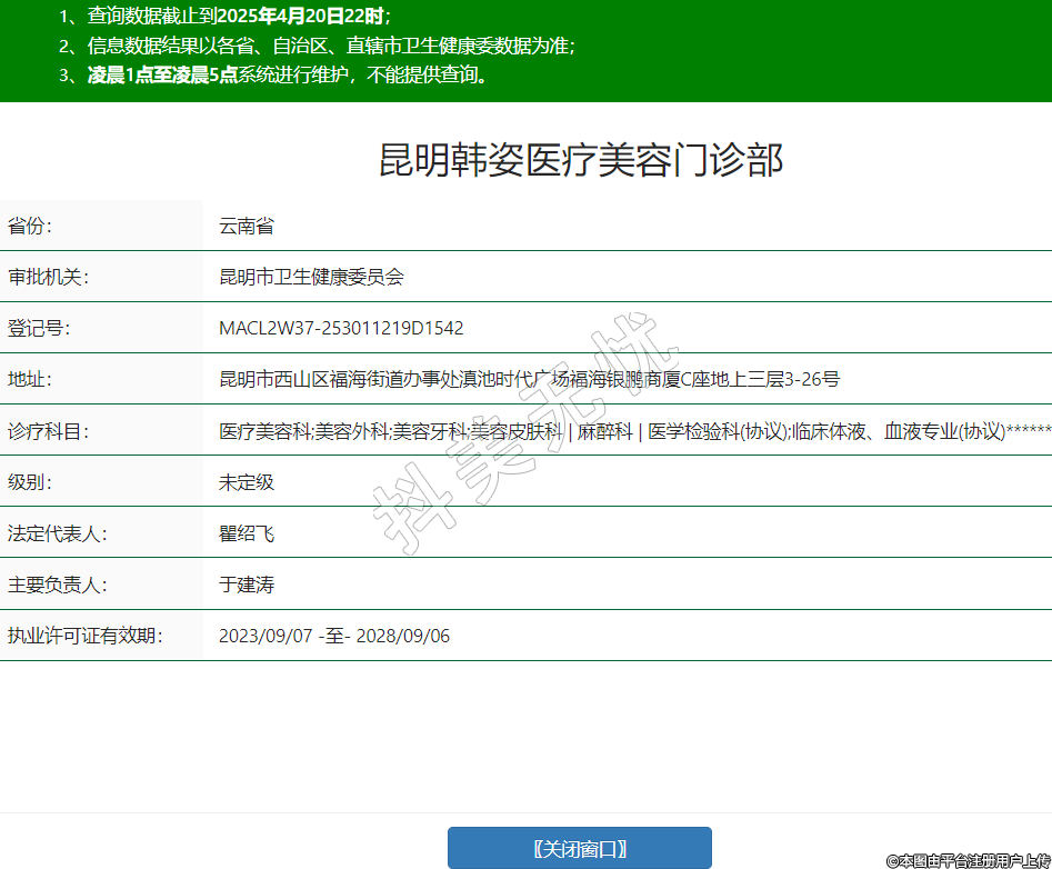 昆明韓姿醫(yī)療美容門診部,診療科目:醫(yī)療美容科;美容外科;美容牙科;美容皮膚科 | 麻醉科 | 醫(yī)學檢驗科(協(xié)議);臨床體液、血液專業(yè)(協(xié)議)******