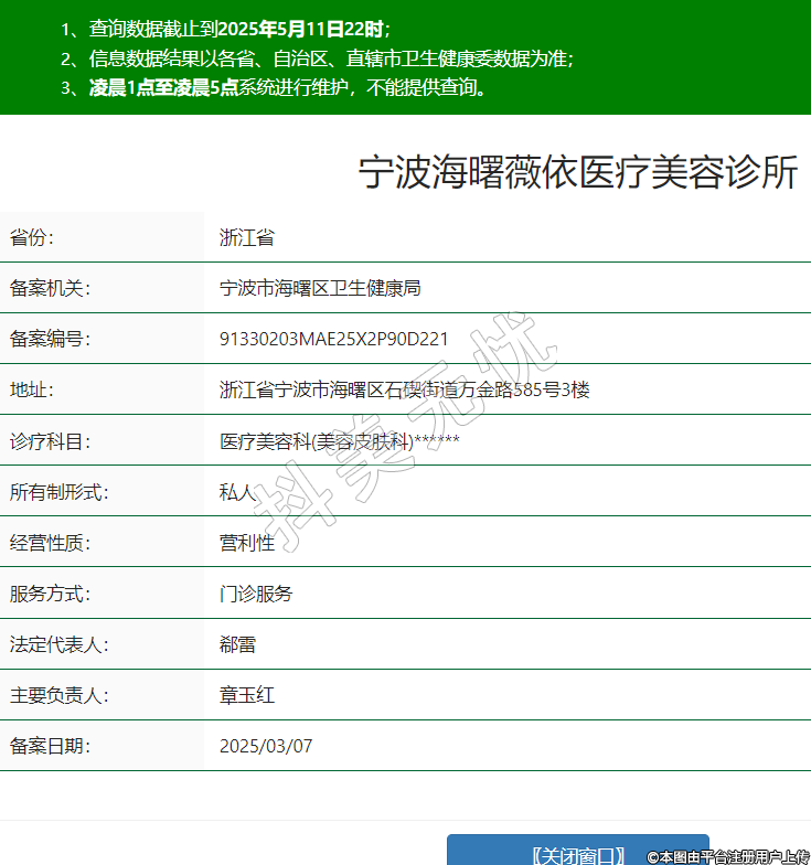 省份:浙江省備案機關(guān):寧波市海曙區(qū)衛(wèi)生健康局備案編號:91330203MAE25X2P90D221地址:浙江省寧波市海曙區(qū)石碶街道萬金路585號3樓診療科目:醫(yī)療美容科(美容皮膚科)******所有制形式:私人經(jīng)營性質(zhì):營利性服務(wù)方式:門診服務(wù)法定代表人:郗雷主要負責(zé)人:章玉紅備案日期:2025/03/07 -