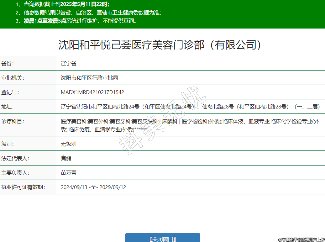 沈陽和平悅己薈醫(yī)療美容門診部(有限公司),診療科目:醫(yī)療美容科;美容外科;美容牙科;美容皮膚科 | 麻醉科 | 醫(yī)學(xué)檢驗(yàn)科(外委);臨床體液、血液專業(yè);臨床化學(xué)檢驗(yàn)專業(yè)(外委);臨床免疫、血清學(xué)專業(yè)(外委)******