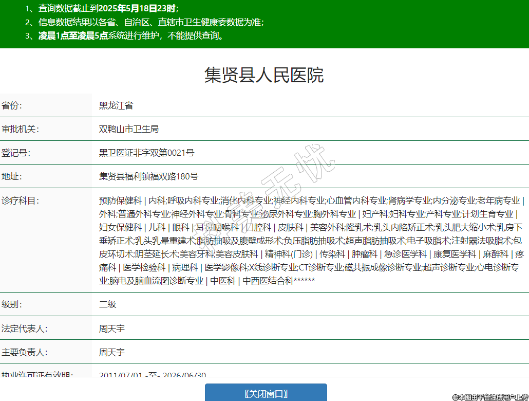 省份:黑龍江省審批機(jī)關(guān):雙鴨山市衛(wèi)生局登記號:黑衛(wèi)醫(yī)證非字雙第0021號地址:集賢縣福利鎮(zhèn)福雙路180號診療科目:預(yù)防保健科 | 內(nèi)科;呼吸內(nèi)科專業(yè);消化內(nèi)科專業(yè);神經(jīng)內(nèi)科專業(yè);心血管內(nèi)科專業(yè);腎病學(xué)專業(yè);內(nèi)分泌專業(yè);老年病專業(yè) | 外科;普通外科專業(yè);神經(jīng)外科專業(yè);骨科專業(yè);泌尿外科專業(yè);胸外科專業(yè) | 婦產(chǎn)科;婦科專業(yè);產(chǎn)科專業(yè);計劃生育專業(yè) | 婦女保健科 | 兒科 | 眼科 | 耳鼻咽喉科 | 口腔科 | 皮膚科 | 美容外科;隆乳術(shù);乳頭內(nèi)陷矯正術(shù);乳頭肥大縮小術(shù);乳房下垂矯正術(shù);乳頭乳暈重建術(shù);脂肪抽吸及腹壁成形術(shù);負(fù)壓脂肪抽吸術(shù);超聲脂肪抽吸術(shù);電子吸脂術(shù);注射器法吸脂術(shù);包皮環(huán)切術(shù);陰莖延長術(shù);美容牙科;美容皮膚科 | 精神科(門診) | 傳染科 | 腫瘤科 | 急診醫(yī)學(xué)科 | 康復(fù)醫(yī)學(xué)科 | 麻醉科 | 疼痛科 | 醫(yī)學(xué)檢驗科 | 病理科 | 醫(yī)學(xué)影像科;X線診斷專業(yè);CT診斷專業(yè);磁共振成像診斷專業(yè);超聲診斷專業(yè);心電診斷專業(yè);腦電及腦血流圖診斷專業(yè) | 中醫(yī)科 | 中西醫(yī)結(jié)合科******級別:二級法定代表人:周天宇主要負(fù)責(zé)人:周天宇執(zhí)業(yè)許可證有效期:2011/07/01 -至- 2026/06/30 -