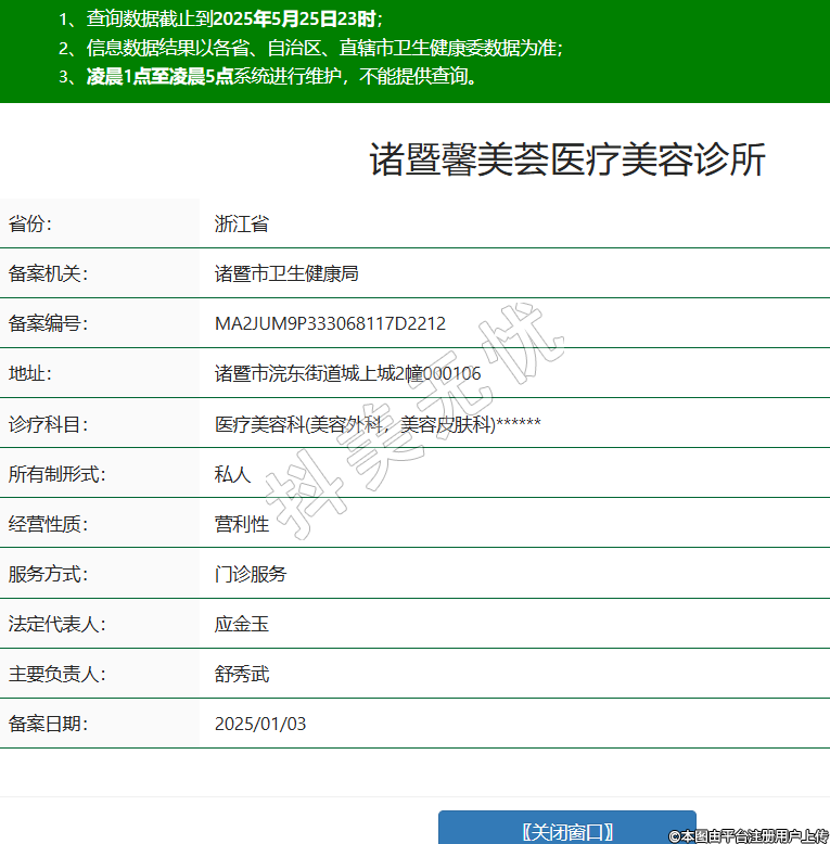省份:浙江省備案機(jī)關(guān):諸暨市衛(wèi)生健康局備案編號:MA2JUM9P333068117D2212地址:諸暨市浣東街道城上城2幢000106診療科目:醫(yī)療美容科(美容外科,美容皮膚科)******所有制形式:私人經(jīng)營性質(zhì):營利性服務(wù)方式:門診服務(wù)法定代表人:應(yīng)金玉主要負(fù)責(zé)人:舒秀武備案日期:2025/01/03 -