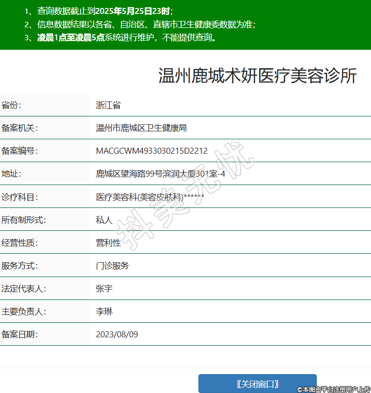 省份:浙江省備案機(jī)關(guān):溫州市鹿城區(qū)衛(wèi)生健康局備案編號(hào):MACGCWM4933030215D2212地址:鹿城區(qū)望海路99號(hào)濱潤(rùn)大廈301室-4診療科目:醫(yī)療美容科(美容皮膚科)******所有制形式:私人經(jīng)營(yíng)性質(zhì):營(yíng)利性服務(wù)方式:門診服務(wù)法定代表人:張宇主要負(fù)責(zé)人:李琳備案日期:2023/08/09 -
