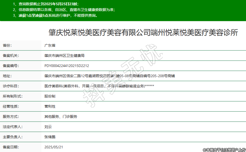 省份:廣東省備案機關(guān):肇慶市端州區(qū)衛(wèi)生健康局備案編號:PDY00042244120215D2212地址:肇慶市端州區(qū)信安二路12號嘉湖君悅花園第1幢05-08號商鋪自編號205-208號商鋪診療科目:醫(yī)療美容科(美容外科,開展一級項目,不得開展靜脈輸液業(yè)務(wù))******所有制形式:股份制經(jīng)營性質(zhì):營利性服務(wù)方式:其他服務(wù)、門診服務(wù)法定代表人:劉云主要負(fù)責(zé)人:張緒鵬備案日期:2025/05/21