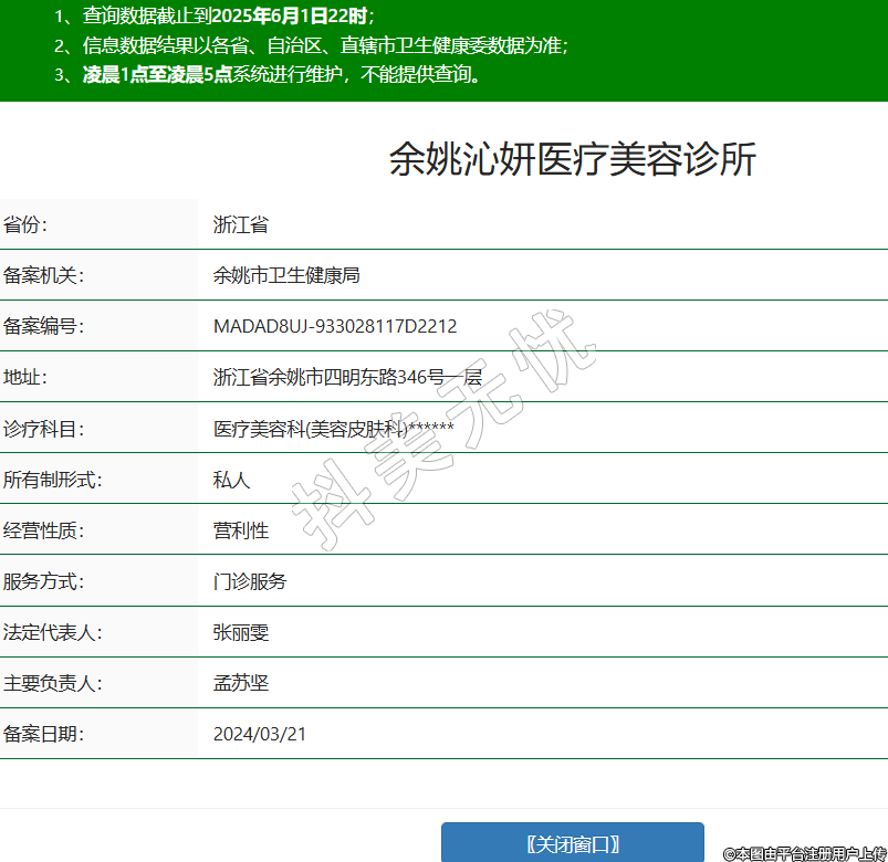 省份:浙江省備案機(jī)關(guān):余姚市衛(wèi)生健康局備案編號(hào):MADAD8UJ-933028117D2212地址:浙江省余姚市四明東路346號(hào)一層診療科目:醫(yī)療美容科(美容皮膚科)******所有制形式:私人經(jīng)營性質(zhì):營利性服務(wù)方式:門診服務(wù)法定代表人:張麗雯主要負(fù)責(zé)人:孟蘇堅(jiān)備案日期:2024/03/21 -