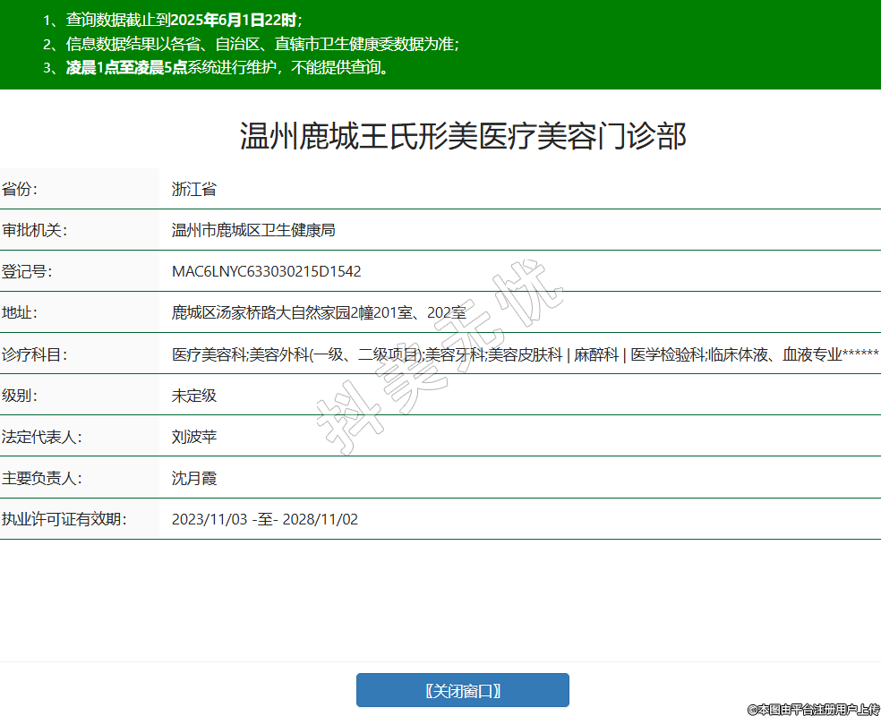 省份:浙江省審批機(jī)關(guān):溫州市鹿城區(qū)衛(wèi)生健康局登記號:MAC6LNYC633030215D1542地址:鹿城區(qū)湯家橋路大自然家園2幢201室、202室診療科目:醫(yī)療美容科;美容外科(一級、二級項(xiàng)目);美容牙科;美容皮膚科 | 麻醉科 | 醫(yī)學(xué)檢驗(yàn)科;臨床體液、血液專業(yè)******級別:未定級法定代表人:劉波蘋主要負(fù)責(zé)人:沈月霞執(zhí)業(yè)許可證有效期:2023/11/03 -至- 2028/11/02 -