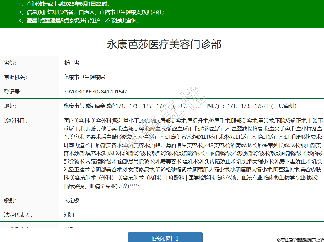 省份:浙江省審批機(jī)關(guān):永康市衛(wèi)生健康局登記號(hào):PDY00309933078417D1542地址:永康市東城街道金城路171、173、175、177號(hào)(一層、二層、四層);171、173、175號(hào)(三層南側(cè))診療科目:醫(yī)療美容科;美容外科(吸脂量小于2000ML);眉部美容術(shù);眉提升術(shù);修眉手術(shù);眼部美容術(shù);重瞼術(shù);下瞼袋矯正術(shù);上瞼下垂矯正術(shù);眼瞼其他美容術(shù);鼻部美容術(shù);隆鼻術(shù);駝峰鼻矯正術(shù);鷹鉤鼻矯正術(shù);鼻翼缺損修復(fù)術(shù);鼻尖美容術(shù);鼻小柱及鼻孔美容術(shù);唇裂術(shù)后鼻畸形修復(fù)術(shù);歪鼻矯正術(shù);耳廓美容術(shù);招風(fēng)耳矯正術(shù);杯狀耳矯正術(shù);隱耳矯正術(shù);耳垂畸形修復(fù)術(shù);耳廓再造術(shù);口唇部美容術(shù);重唇美容術(shù);唇峰、薄唇增厚美容術(shù);唇珠美容術(shù);酒窩成形術(shù);唇系帶延長(zhǎng)成形術(shù);頜面部美容術(shù);顳部填充術(shù);頦成形術(shù);面部除皺術(shù);額部除皺術(shù);顳部除皺術(shù);中面部除皺術(shù);額顳部除皺術(shù);額顳面部除皺術(shù);顳面頸部除皺術(shù);內(nèi)窺鏡除皺術(shù);面部懸吊除皺術(shù);乳房美容術(shù);隆乳術(shù);乳頭內(nèi)陷矯正術(shù);乳頭肥大縮小術(shù);乳房下垂矯正術(shù);乳頭乳暈重建術(shù);會(huì)陰部美容術(shù);處女膜修復(fù)術(shù);陰道松弛縮緊術(shù);陰蒂肥大縮小術(shù);小陰唇肥大縮小術(shù);陰莖延長(zhǎng)術(shù);美容皮膚科;美容皮膚術(shù)(外科);美容皮膚術(shù)(內(nèi)科) | 麻醉科 | 醫(yī)學(xué)檢驗(yàn)科;臨床體液、血液專業(yè);臨床微生物學(xué)專業(yè)(協(xié)議);臨床免疫、血清學(xué)專業(yè)(協(xié)議)******級(jí)別:未定級(jí)法定代表人:劉娟主要負(fù)責(zé)人:張堯執(zhí)業(yè)許可證有效期:2023/05/15 -至- 2028/05/14 -