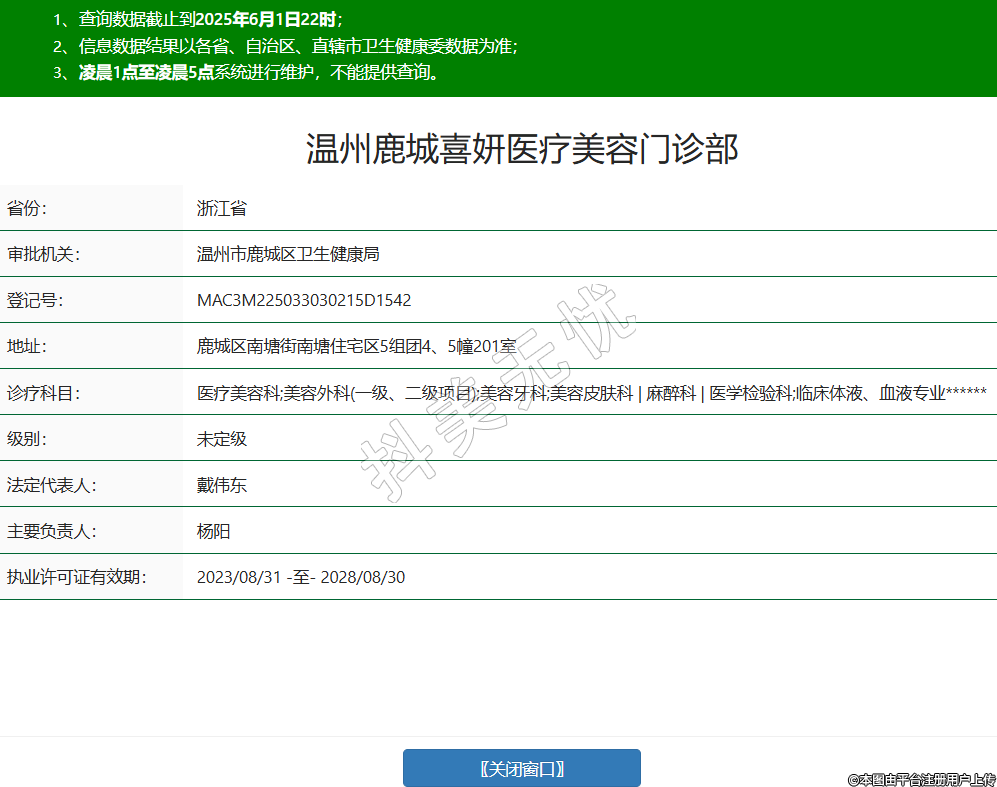 省份:浙江省審批機(jī)關(guān):溫州市鹿城區(qū)衛(wèi)生健康局登記號:MAC3M225033030215D1542地址:鹿城區(qū)南塘街南塘住宅區(qū)5組團(tuán)4、5幢201室診療科目:醫(yī)療美容科;美容外科(一級、二級項目);美容牙科;美容皮膚科 | 麻醉科 | 醫(yī)學(xué)檢驗科;臨床體液、血液專業(yè)******級別:未定級法定代表人:戴偉東主要負(fù)責(zé)人:楊陽執(zhí)業(yè)許可證有效期:2023/08/31 -至- 2028/08/30 -