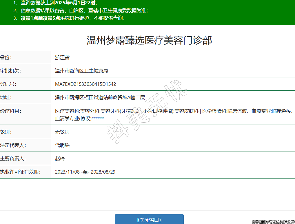 省份:浙江省審批機(jī)關(guān):溫州市甌海區(qū)衛(wèi)生健康局登記號:MA7EXD21533030415D1542地址:溫州市甌海區(qū)梧田街道站前商貿(mào)城A幢二層診療科目:醫(yī)療美容科;美容外科;美容牙科(牙椅2張、不含口腔種植);美容皮膚科 | 醫(yī)學(xué)檢驗(yàn)科;臨床體液、血液專業(yè);臨床免疫、血清學(xué)專業(yè)(協(xié)議)******級別:無級別法定代表人:代明瑤主要負(fù)責(zé)人:趙琦執(zhí)業(yè)許可證有效期:2023/11/08 -至- 2028/08/29 -