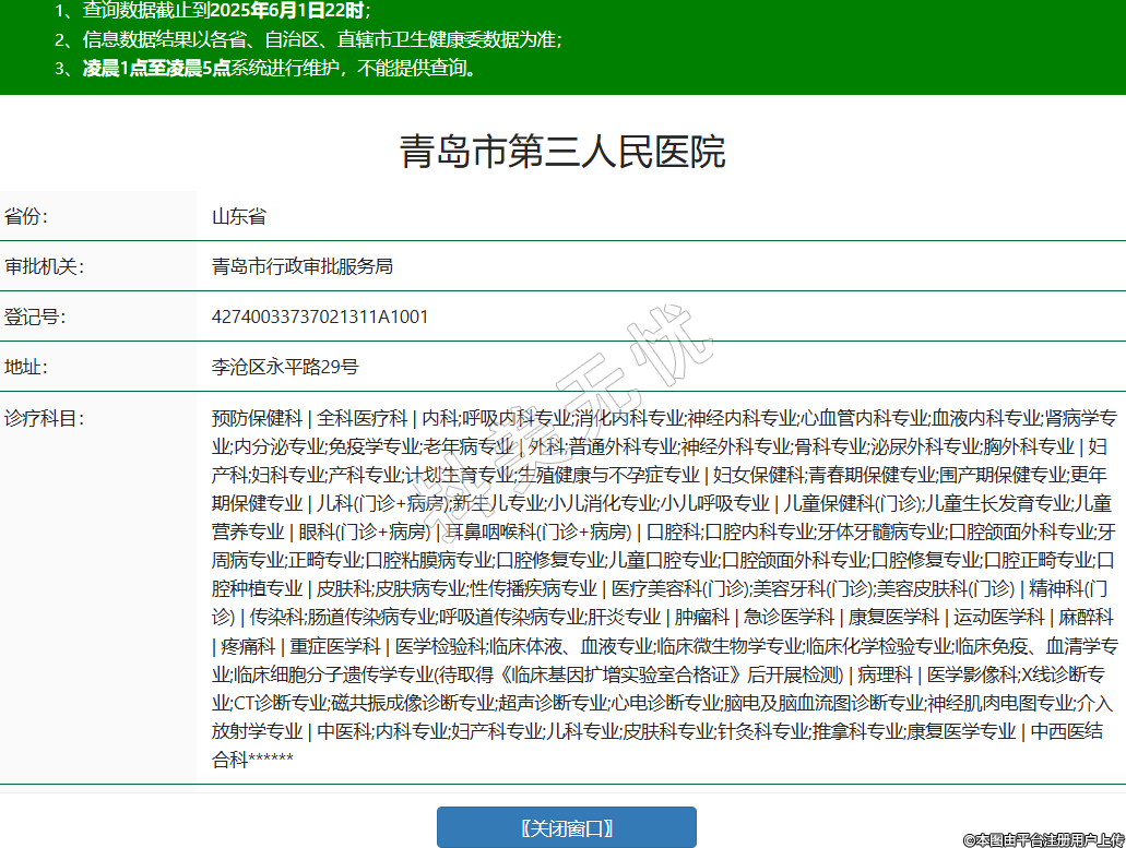 省份:山東省審批機關(guān):青島市行政審批服務(wù)局登記號:42740033737021311A1001地址:李滄區(qū)永平路29號診療科目:預(yù)防保健科 | 全科醫(yī)療科 | 內(nèi)科;呼吸內(nèi)科專業(yè);消化內(nèi)科專業(yè);神經(jīng)內(nèi)科專業(yè);心血管內(nèi)科專業(yè);血液內(nèi)科專業(yè);腎病學(xué)專業(yè);內(nèi)分泌專業(yè);免疫學(xué)專業(yè);老年病專業(yè) | 外科;普通外科專業(yè);神經(jīng)外科專業(yè);骨科專業(yè);泌尿外科專業(yè);胸外科專業(yè) | 婦產(chǎn)科;婦科專業(yè);產(chǎn)科專業(yè);計劃生育專業(yè);生殖健康與不孕癥專業(yè) | 婦女保健科;青春期保健專業(yè);圍產(chǎn)期保健專業(yè);更年期保健專業(yè) | 兒科(門診+病房);新生兒專業(yè);小兒消化專業(yè);小兒呼吸專業(yè) | 兒童保健科(門診);兒童生長發(fā)育專業(yè);兒童營養(yǎng)專業(yè) | 眼科(門診+病房) | 耳鼻咽喉科(門診+病房) | 口腔科;口腔內(nèi)科專業(yè);牙體牙髓病專業(yè);口腔頜面外科專業(yè);牙周病專業(yè);正畸專業(yè);口腔粘膜病專業(yè);口腔修復(fù)專業(yè);兒童口腔專業(yè);口腔頜面外科專業(yè);口腔修復(fù)專業(yè);口腔正畸專業(yè);口腔種植專業(yè) | 皮膚科;皮膚病專業(yè);性傳播疾病專業(yè) | 醫(yī)療美容科(門診);美容牙科(門診);美容皮膚科(門診) | 精神科(門診) | 傳染科;腸道傳染病專業(yè);呼吸道傳染病專業(yè);肝炎專業(yè) | 腫瘤科 | 急診醫(yī)學(xué)科 | 康復(fù)醫(yī)學(xué)科 | 運動醫(yī)學(xué)科 | 麻醉科 | 疼痛科 | 重癥醫(yī)學(xué)科 | 醫(yī)學(xué)檢驗科;臨床體液、血液專業(yè);臨床微生物學(xué)專業(yè);臨床化學(xué)檢驗專業(yè);臨床免疫、血清學(xué)專業(yè);臨床細胞分子遺傳學(xué)專業(yè)(待取得《臨床基因擴增實驗室合格證》后開展檢測) | 病理科 | 醫(yī)學(xué)影像科;X線診斷專業(yè);CT診斷專業(yè);磁共振成像診斷專業(yè);超聲診斷專業(yè);心電診斷專業(yè);腦電及腦血流圖診斷專業(yè);神經(jīng)肌肉電圖專業(yè);介入放射學(xué)專業(yè) | 中醫(yī)科;內(nèi)科專業(yè);婦產(chǎn)科專業(yè);兒科專業(yè);皮膚科專業(yè);針灸科專業(yè);推拿科專業(yè);康復(fù)醫(yī)學(xué)專業(yè) | 中西醫(yī)結(jié)合科******級別:三級法定代表人:于華主要負責(zé)人:于華執(zhí)業(yè)許可證有效期:2023/12/23 -至- 2038/12/22 -